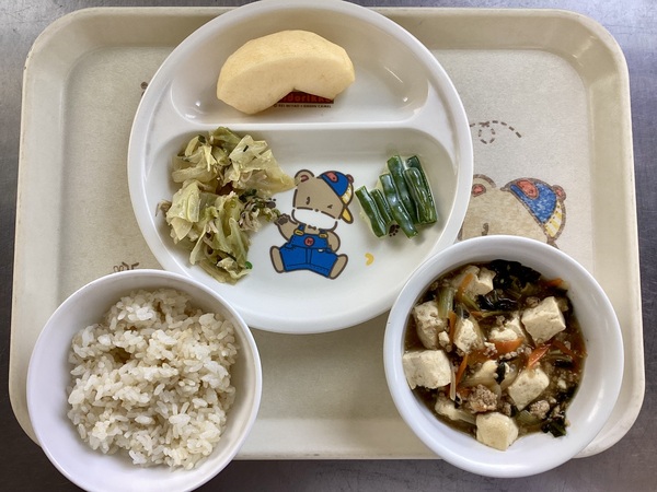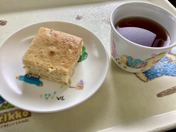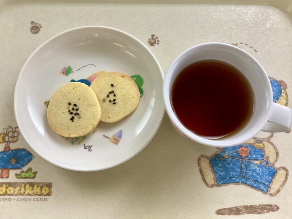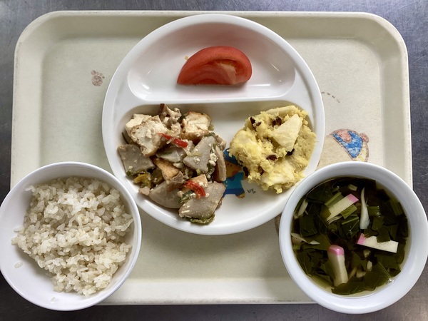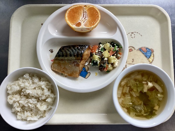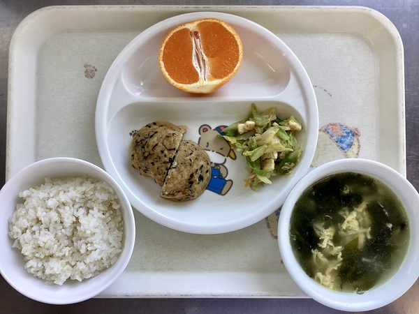 給食:ご飯、黒つくね蓮根照り焼き、おかかチーズ和え、卵わかめスープ、みかん🍊 おやつ:かぼちゃプリン🎃