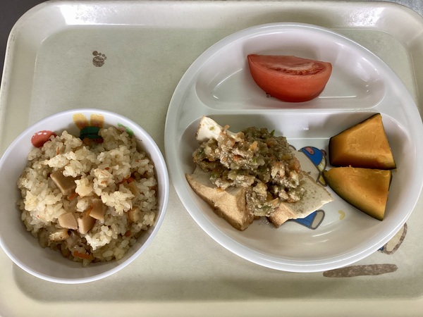 給食:中華おこわ、厚揚げ肉味噌あんかけ、かぼちゃ煮、トマト おやつ:麦茶、花団子