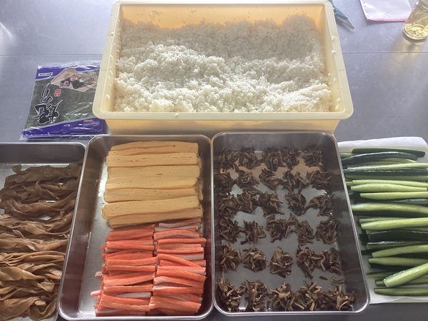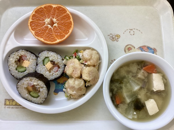 給食:太巻き寿司、えびマヨサラダ、国清汁、みかん🍊 おやつ:麦茶 鬼まんじゅう
