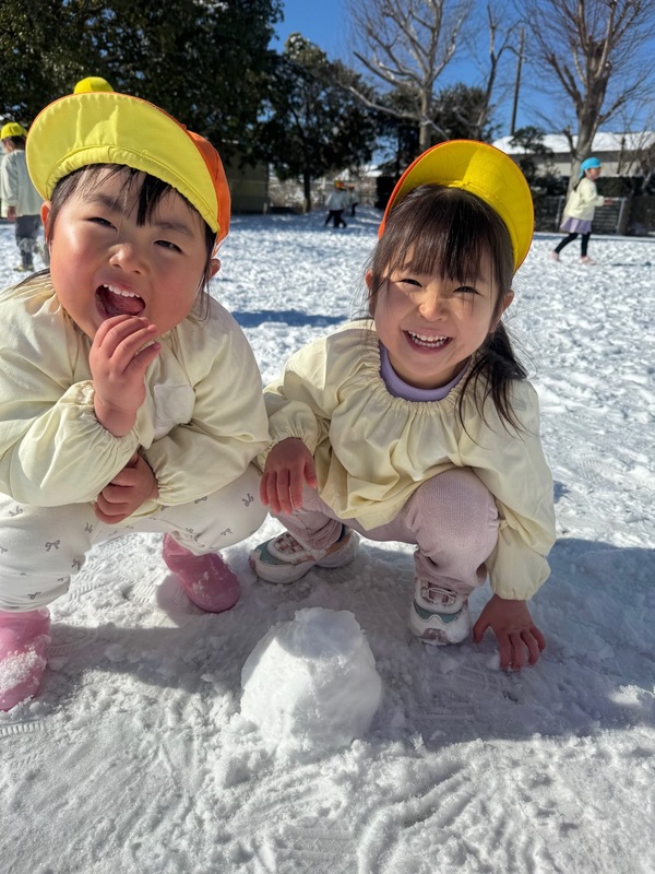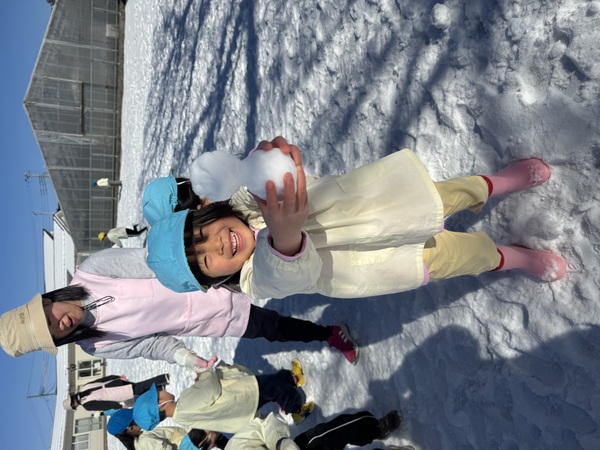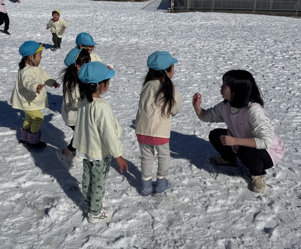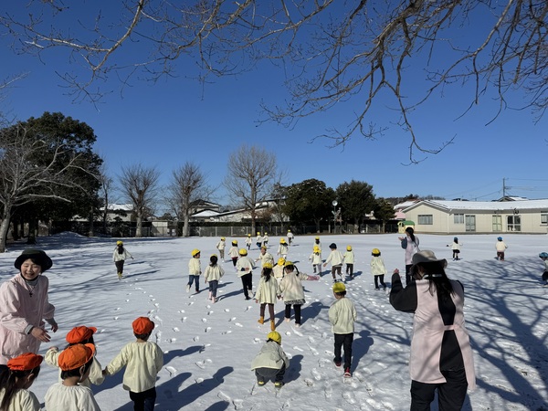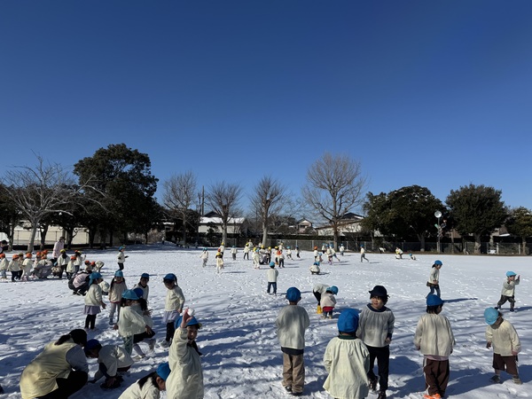 | 土日にたくさん雪が降り、保育園の園庭も雪景色になっていました。 ここまで積もることも中々ないので、溶ける前に皆で雪遊びをしました。 まだ誰も踏んでいない綺麗な雪が一面に広がったグラウンドへ!! 皆が一斉に駆け出していき、とにかく楽しそうな子ども達!! 職員も子ども達と一緒に全力で楽しみました☆ |