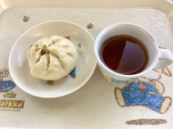 おやつ:肉まん 今日のおやつは、ほかほかふわふわの肉まんです。肉まんなどの中華まんは、中国の包子(パオズ)を元に、日本人向けに作られたものです。園では、豚ひき肉、玉葱、長葱、竹の子が入った餡を包み、蒸しました。生地も一から手作りで、10kg程の生地を手ごねしました。 |