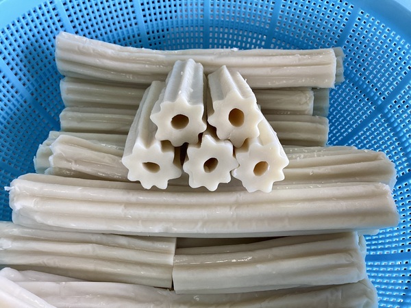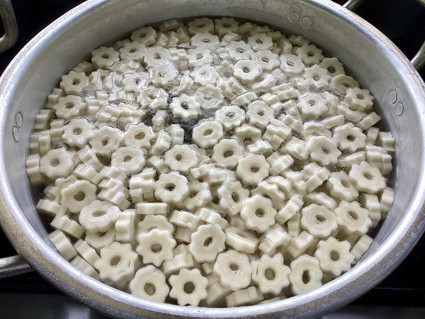 廊下から、「今日のおやつ何?」と子どもたちの声が聞こえ、先生が説明していました🌸 おやつの花団子は、輪切りにすると可愛い花型になる「ちくわぶ」を使っています。あまり馴染みのない食材かも知れませんが、みたらし団子とは違い、未満児でも安全にモチモチの食感を楽しむ事ができます。