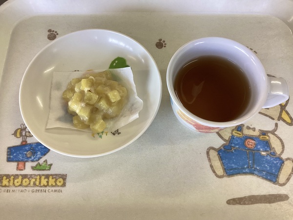 給食:ご飯、松風焼き、炒めなます、栗きんとん おやつ:麦茶、ほうれん草蒸しパン