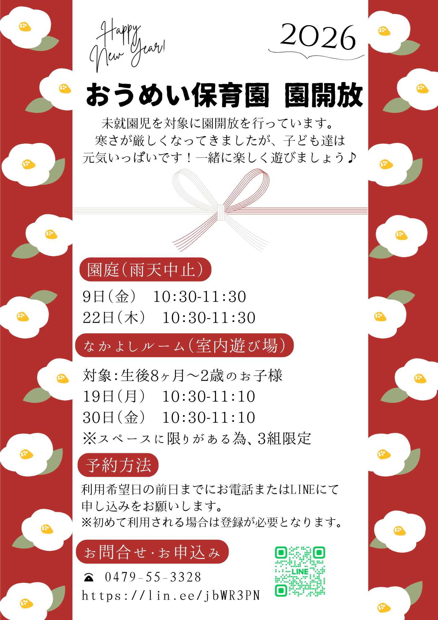 受付時間 9:00〜16:00園開放 未就園児を対象に園開放を行っております。広い園庭でみんなと一緒に遊びましょう!予約制となっておりますので、お電話またはLINEにて事前のご連絡をお願いします。 園開放(1月)